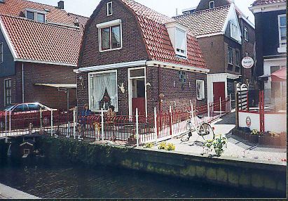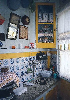 We then continued by boat to the traditional fishing village of Enkhuizen. This village was one of several on the edge of the Zuiderzee whose economies were ruined when access to the North Sea was blocked by construction of a dam in 1932. The water behind the dam was gradually converted from salt to fresh. The only major sea life that survived the change was the eel. As a result, eel is commonly smoked, sold, and eaten in these villages. Kathleen enjoyed an eel sandwich on the way over but I was not able to work up the courage to try it. The economy of Enkhuizen recovered when the Zuiderzee Museum was opened to attract tourists interested in the traditional fishing life that existed there once. Several rescued homes were renovated to create a typical Zuiderzee village for tourists to enjoy. The old fishing harbor then was converted into a yachting marina. The picture below shows the kitchen interior of a renovated fisherman's home in Enkhuizen. Note the delft tiles.
