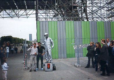 At the base of the Eiffel Tower there was an unusual street performer dressed as an industrial robot. He amused the crowd with comical poses and body language.
