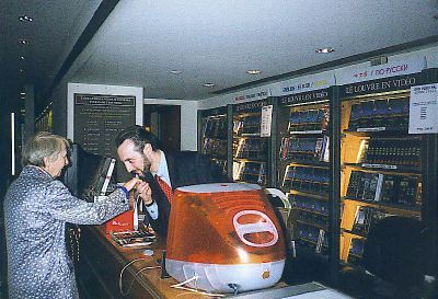 The French love the Mac. I was delighted to see a tangerine iMac placed as a point-of-sale terminal in the Louvre gift shop. The original design for the Macintosh in 1984 is on display in the New York City Museum of Modern Art so I was not surprised to find the iMac also on display in a museum. It is nice to see people value good industrial design. The store manager was surprised when I asked to take a picture of his computer but he got into character with gusto as he hailed the nearest available female for a kiss on the hand.